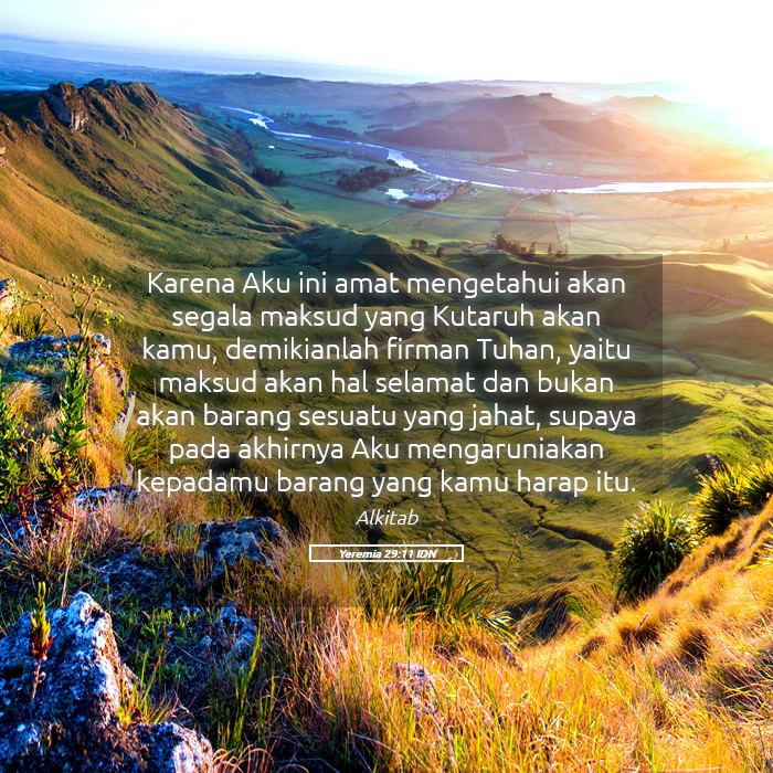 "Sebab Aku ini mengetahui rancangan-rancangan apa yang ada pada-Ku mengenai kamu, demikianlah firman TUHAN, yaitu rancangan damai sejahtera dan bukan rancangan kecelakaan, untuk memberikan kepadamu hari depan yang penuh harapan."