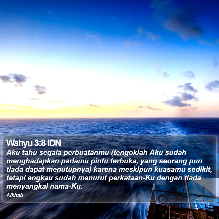 "Aku tahu segala pekerjaanmu: lihatlah, Aku telah membuka pintu bagimu, yang tidak dapat ditutup oleh seorang pun. Aku tahu, bahwa kekuatanmu tidak seberapa, namun engkau menuruti firman-Ku dan engkau tidak menyangkal nama-Ku."